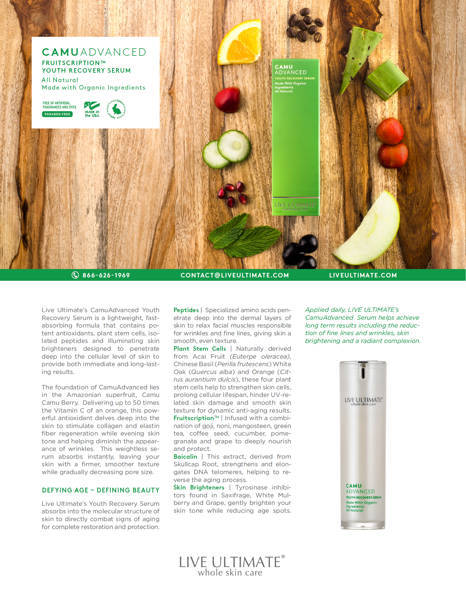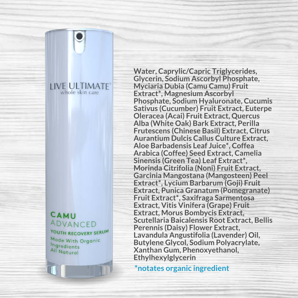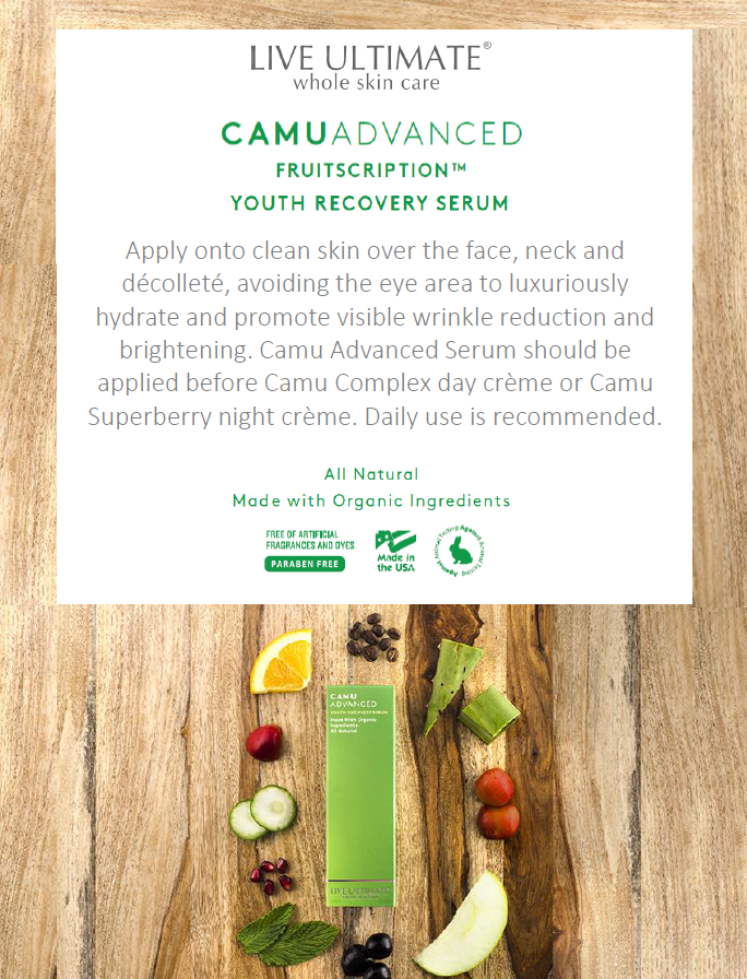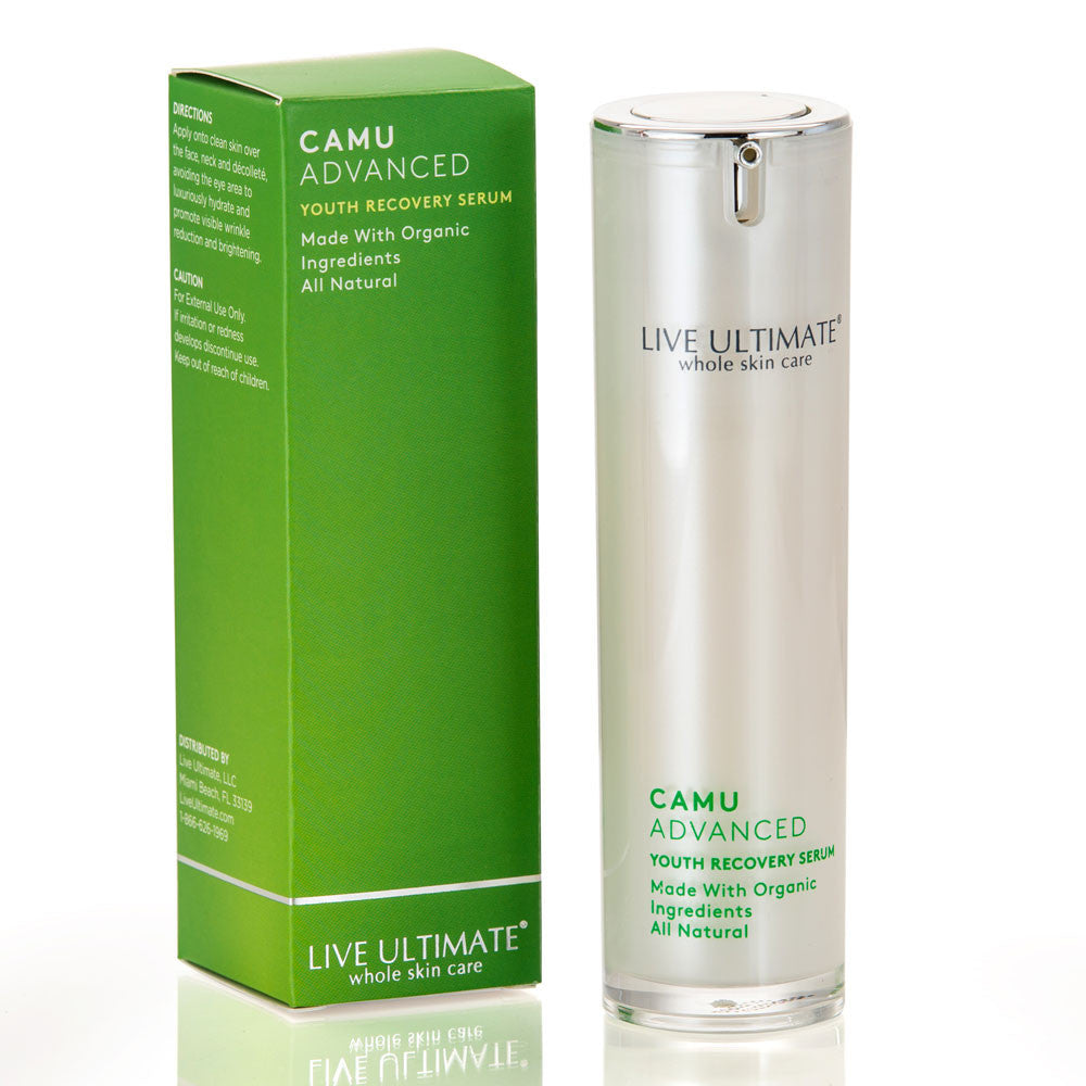Live Ultimate’s CamuAdvanced Youth Recovery Serum is a lightweight, fast-absorbing formula that contains potent antioxidants, plant stem cells, isolated peptides and illuminating skin brighteners designed to penetrate deep into the cellular level of skin to provide both immediate and long-lasting results.