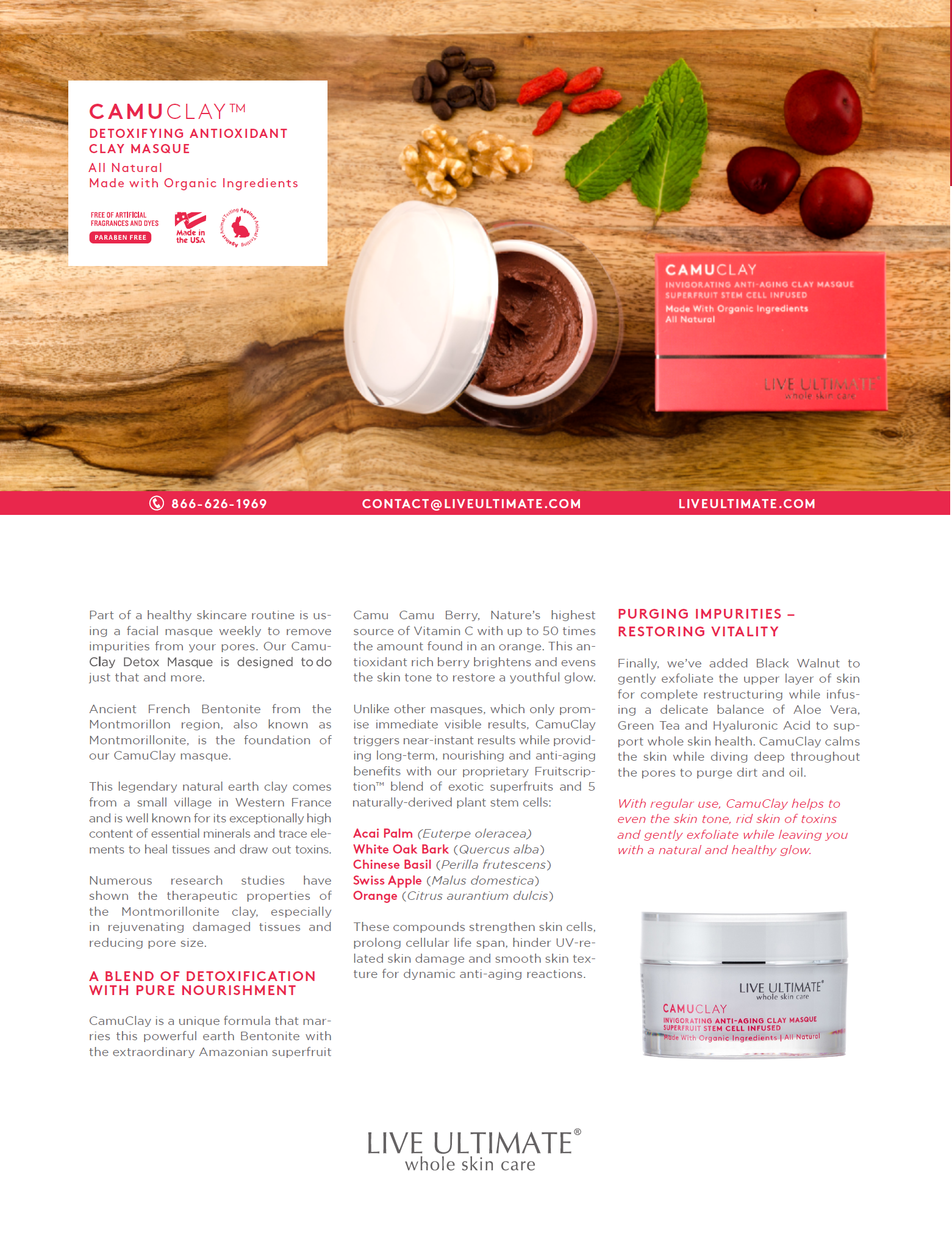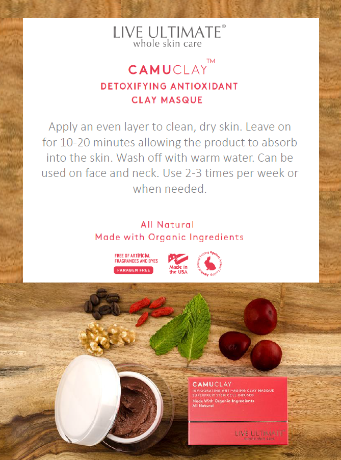 Part of a healthy skincare routine is using a facial masque weekly to remove impurities from your pores. Our CamuClay Detox Maque is designed to do just that and more.