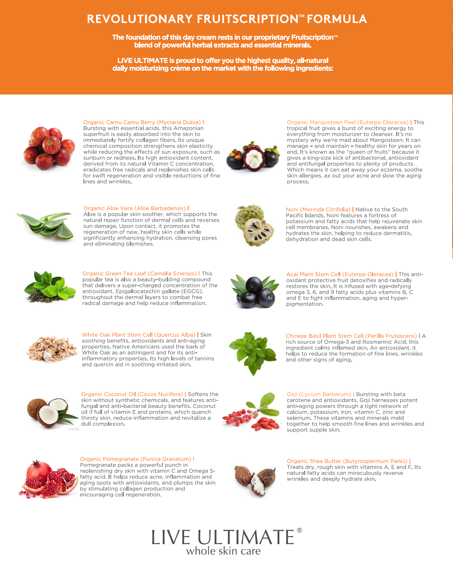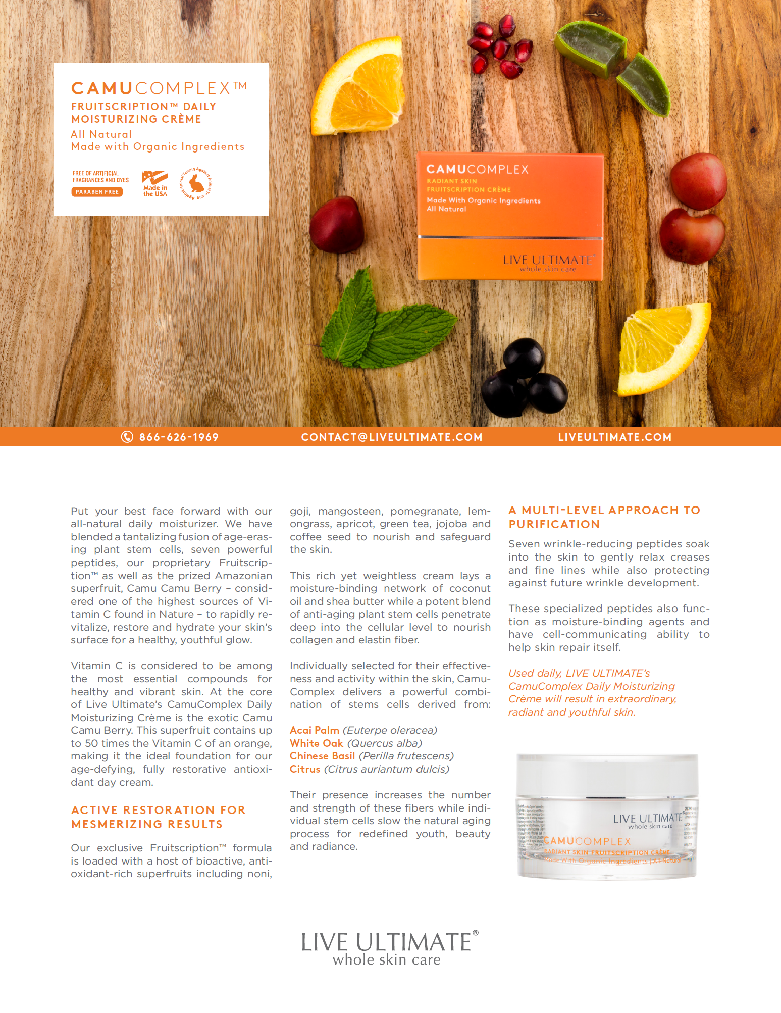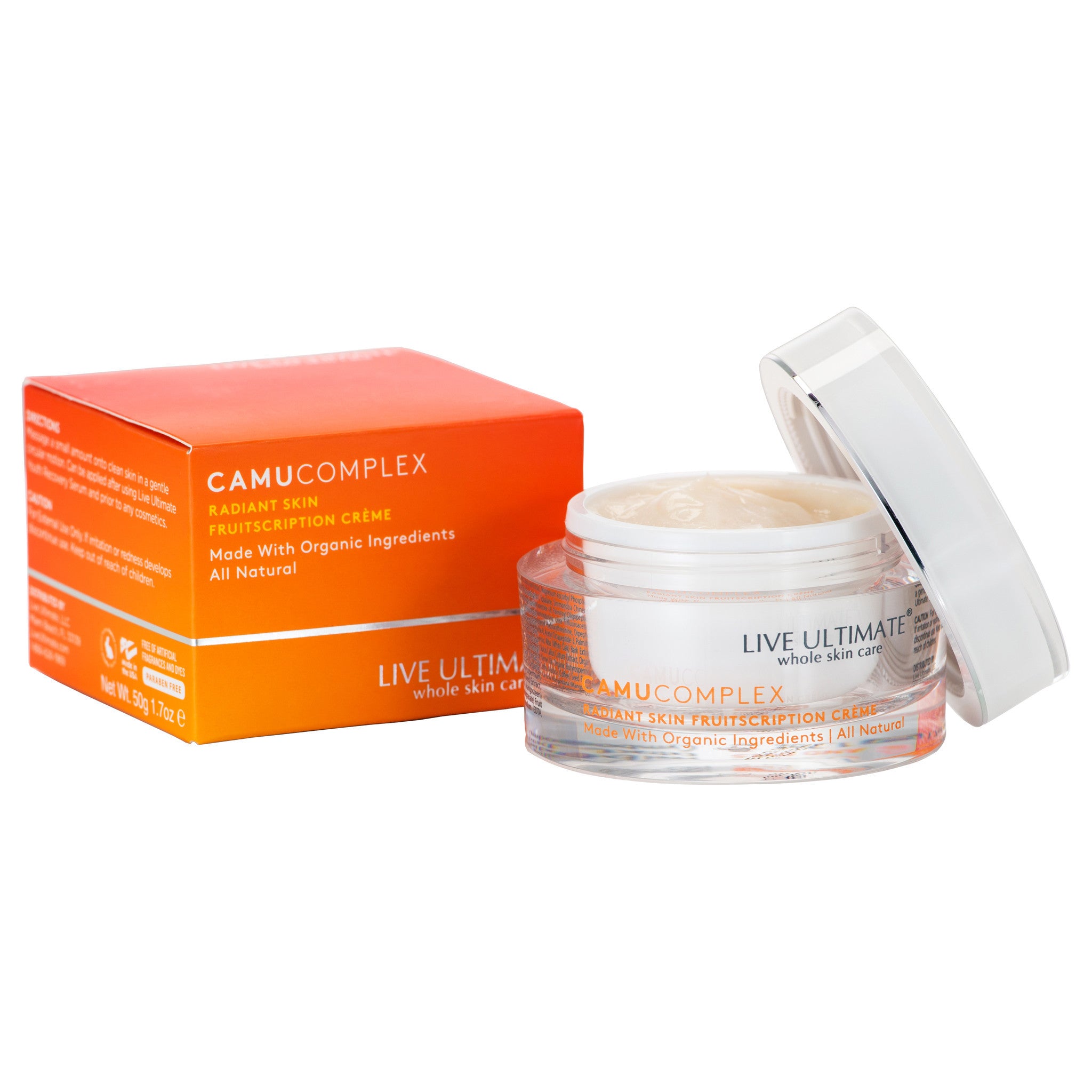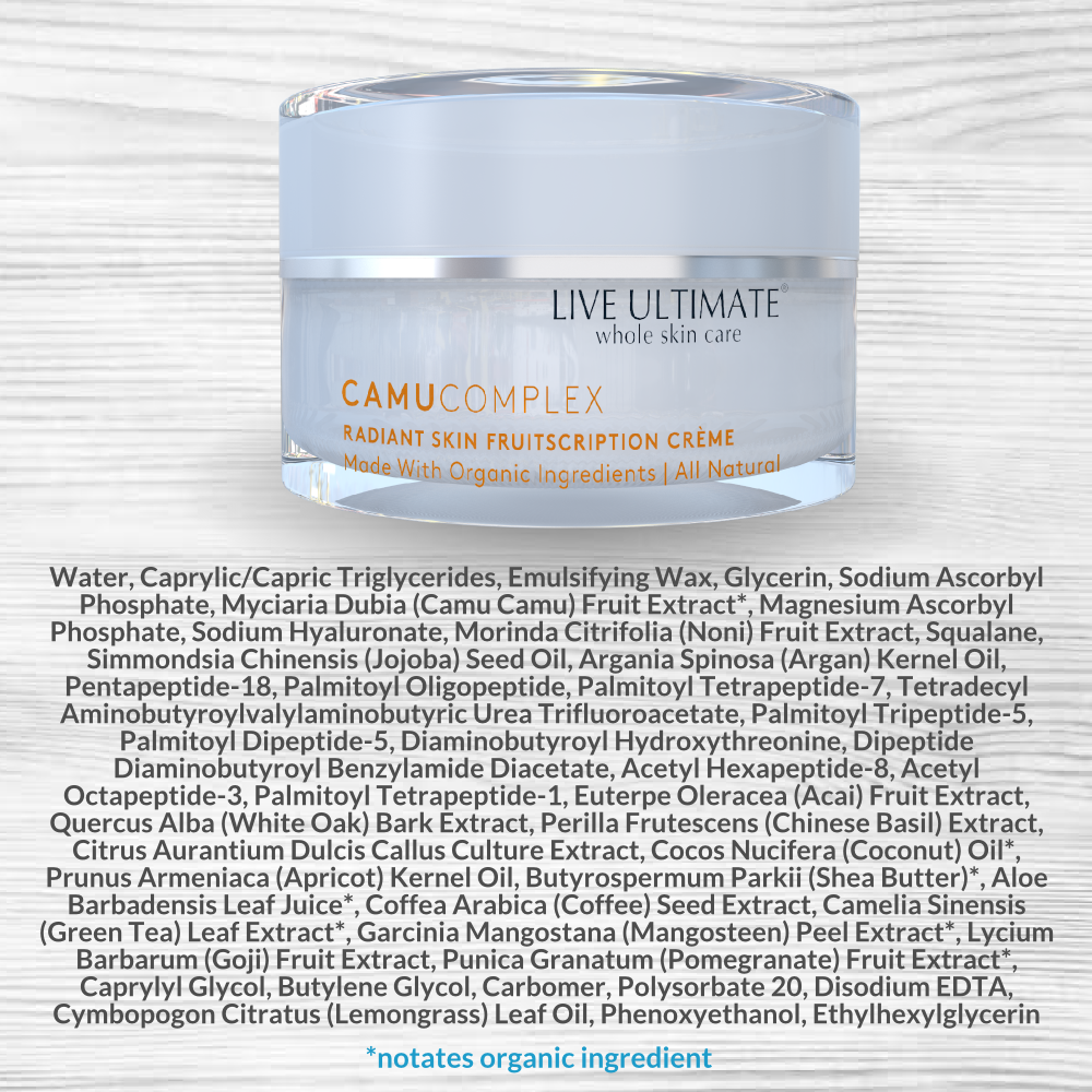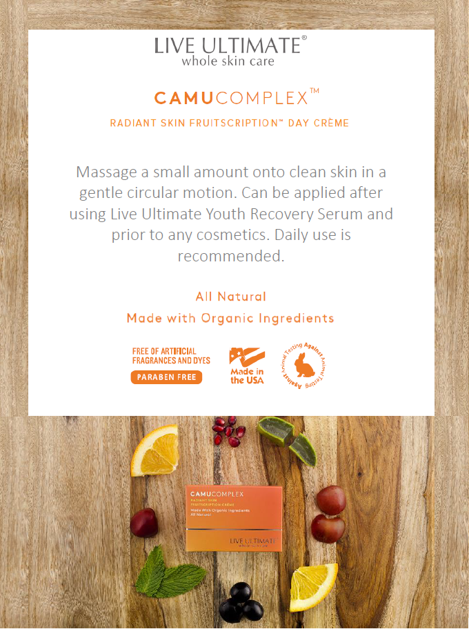Vitamin C is considered to be among the most essential compounds for healthy and vibrant skin. At the core of Live Ultimate’s CamuComplex Daily Moisturizing Crème is the exotic Camu Camu Berry. This superfruit contains up to 50 times the Vitamin C of an orange, making it the ideal foundation for our age-defying, fully restorative antioxidant day cream.