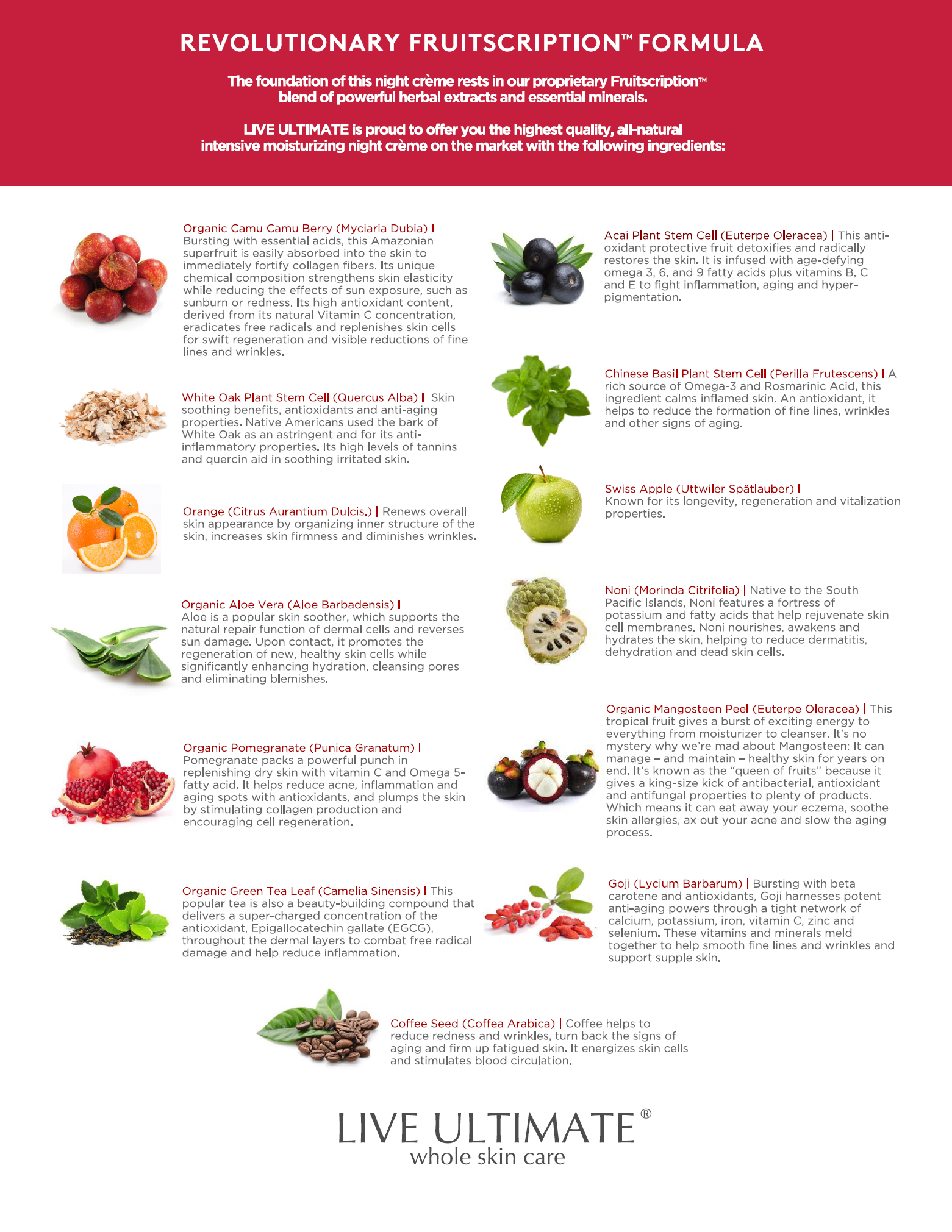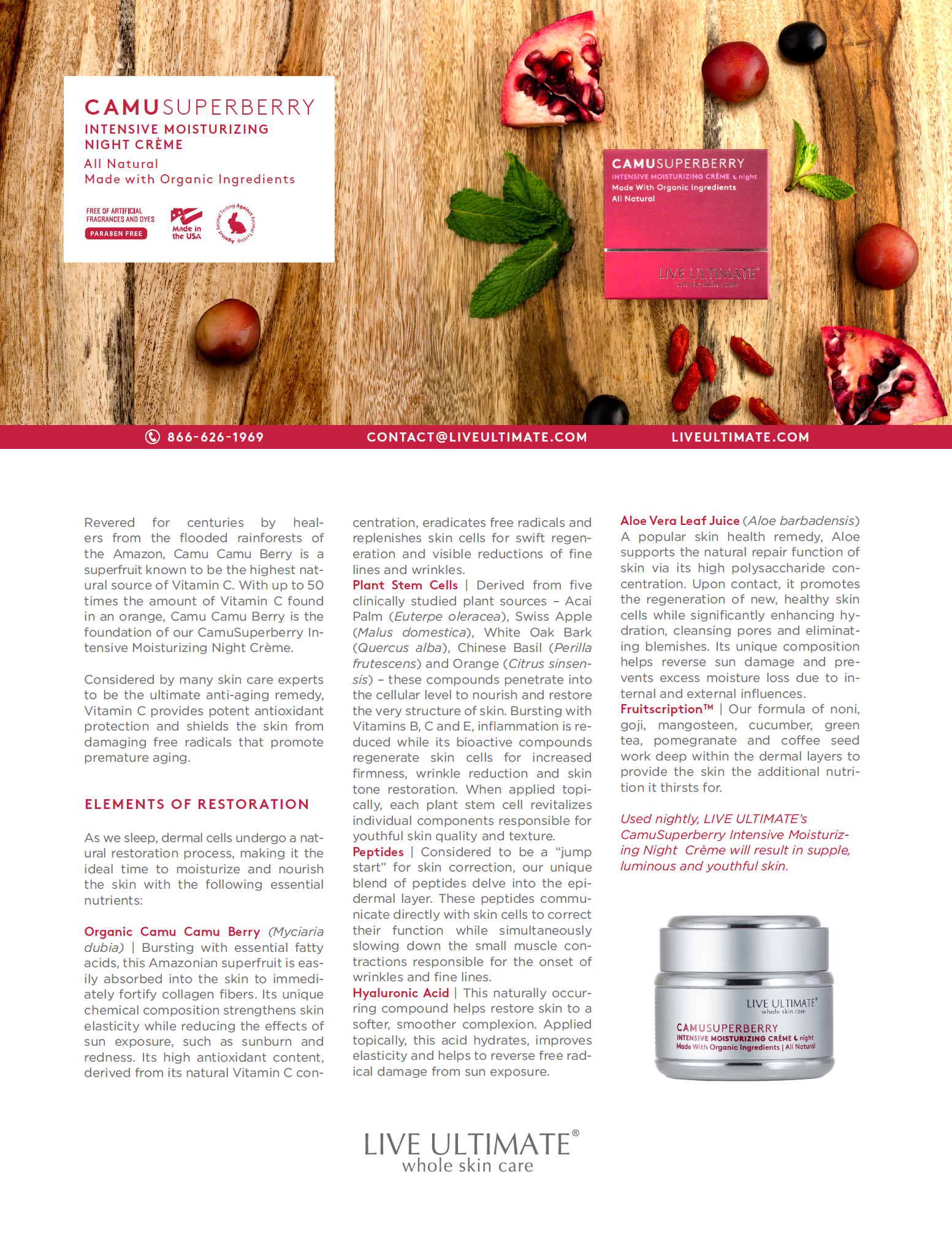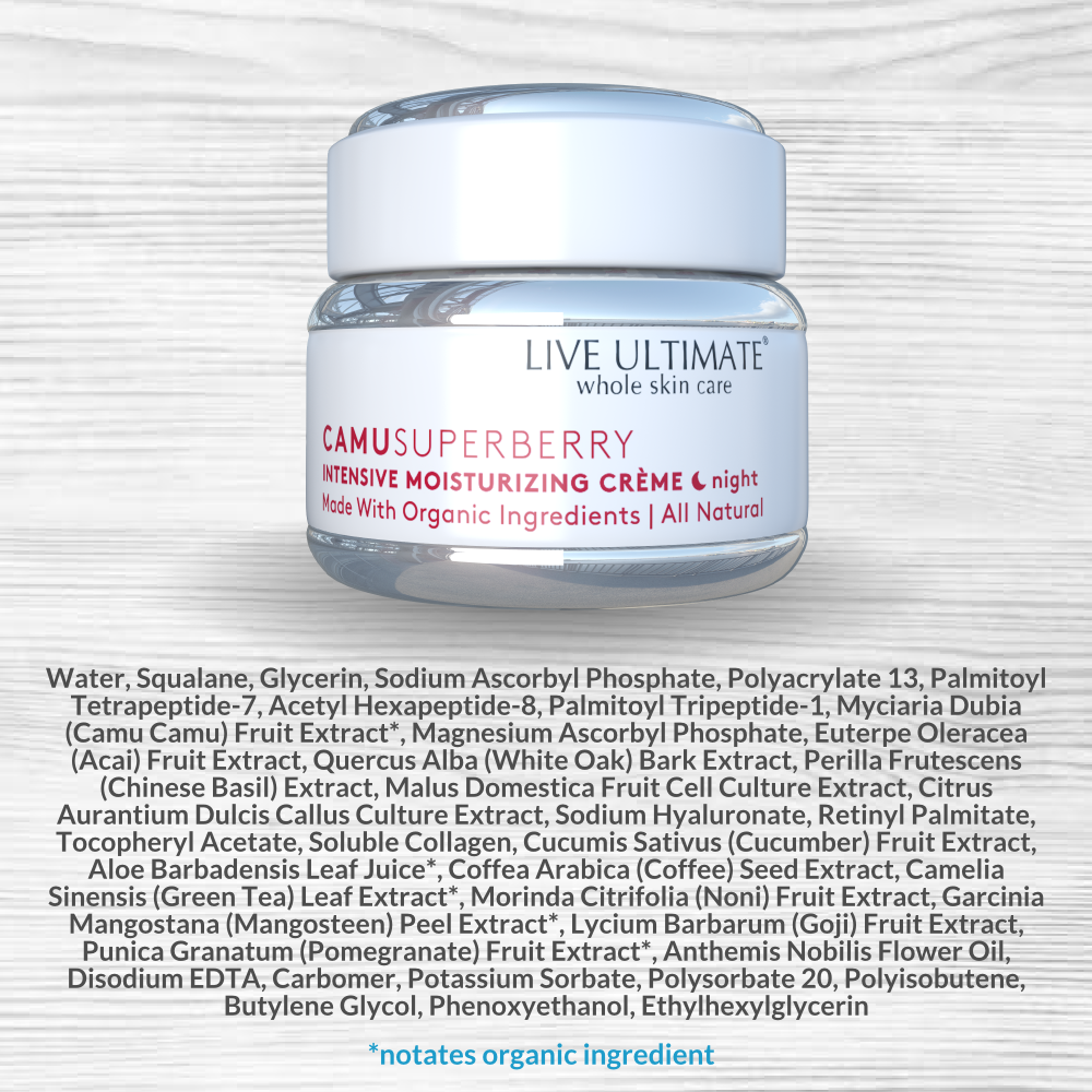 As we sleep, dermal cells undergo a natural restoration process, making it the ideal time to moisturize and nourish the skin with the following essential nutrients:Organic Camu Camu Berry (Myciaria dubia) | Bursting with essential fatty acids, this Amazonian superfruit is easily absorbed into the skin to immediately fortify collagen fibers. Its unique chemical composition strengthens skin elasticity while reducing the effects of sun exposure, such as sunburn and redness. Its high antioxidant content, derived from its natural Vitamin C concentration, eradicates free radicals and replenishes skin cells for swift regeneration and visible reductions of fine lines and wrinkles.