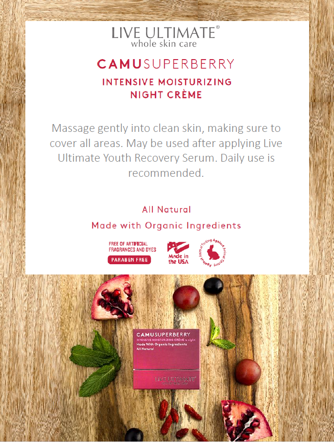 This is a great cream to use at night. I like it because it has a thicker, creamier consistency that's more conducive for use as a night cream. It feels exhilarating when I gently message it into my skin and has a slight fruity hint to it and the aroma relaxes me; yet another benefit as a night cream. Plus, it works great on my sensitive skin. It has a wonderful balance of aloe, green tea and vitamins A, C & E that provide incredible hydration. Plus it has Lavender, Blueberry, Pomegranate, Licorice, Pumpkin, Coconut and Cranberry Extract Oils in it that has powerful skin benefits not to mention it gives it that wonderful scent. I'm sure that's why it is called "camusuperberry" because of all the wonderful fruit extracts in it.