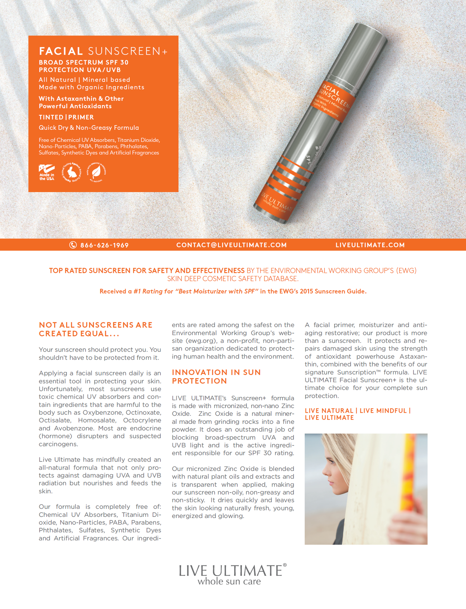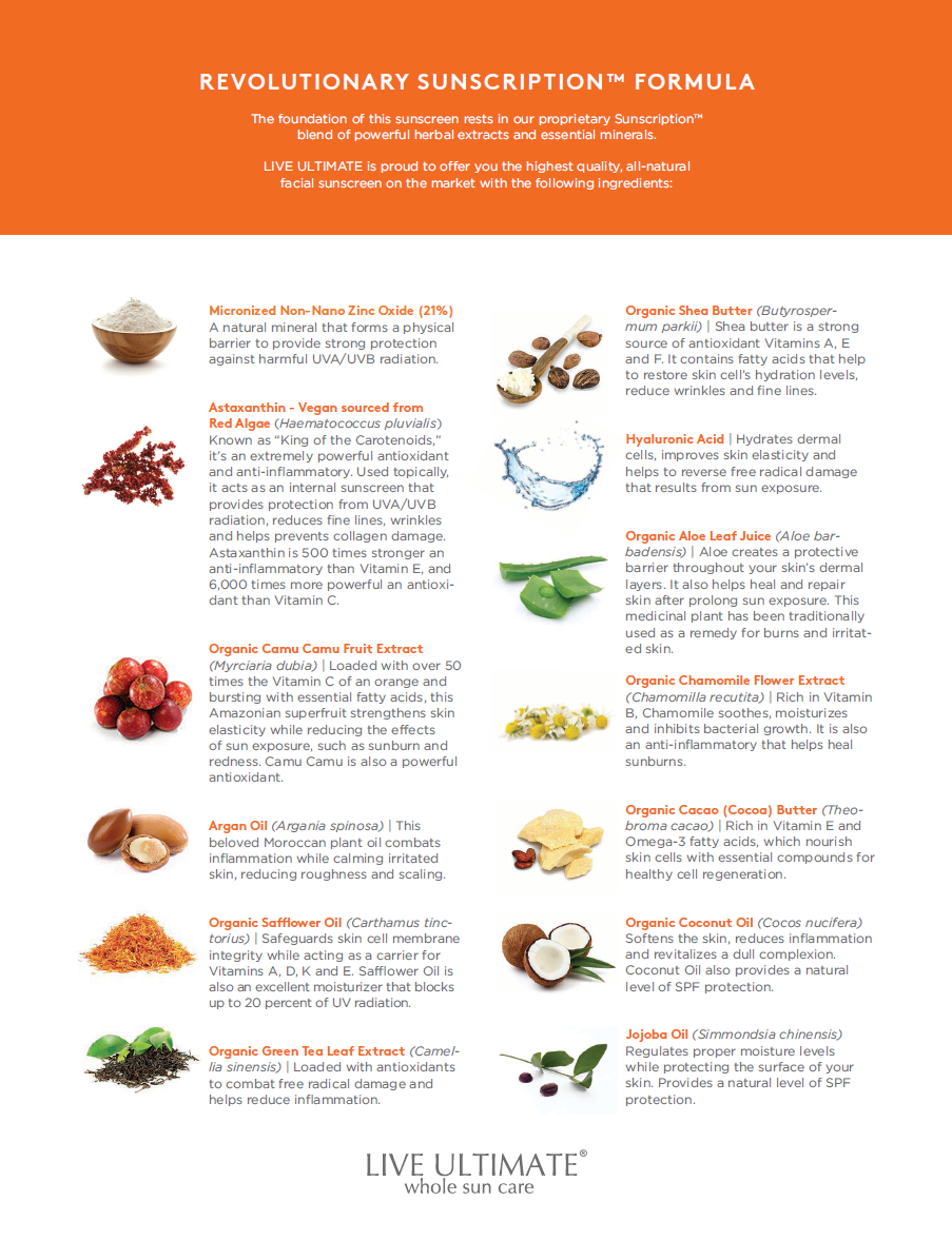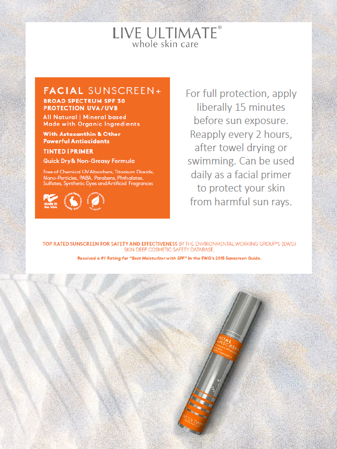 Live Ultimate has mindfully created an all-natural formula that not only protects against damaging UVA and UVB radiation but nourishes and feeds the skin.