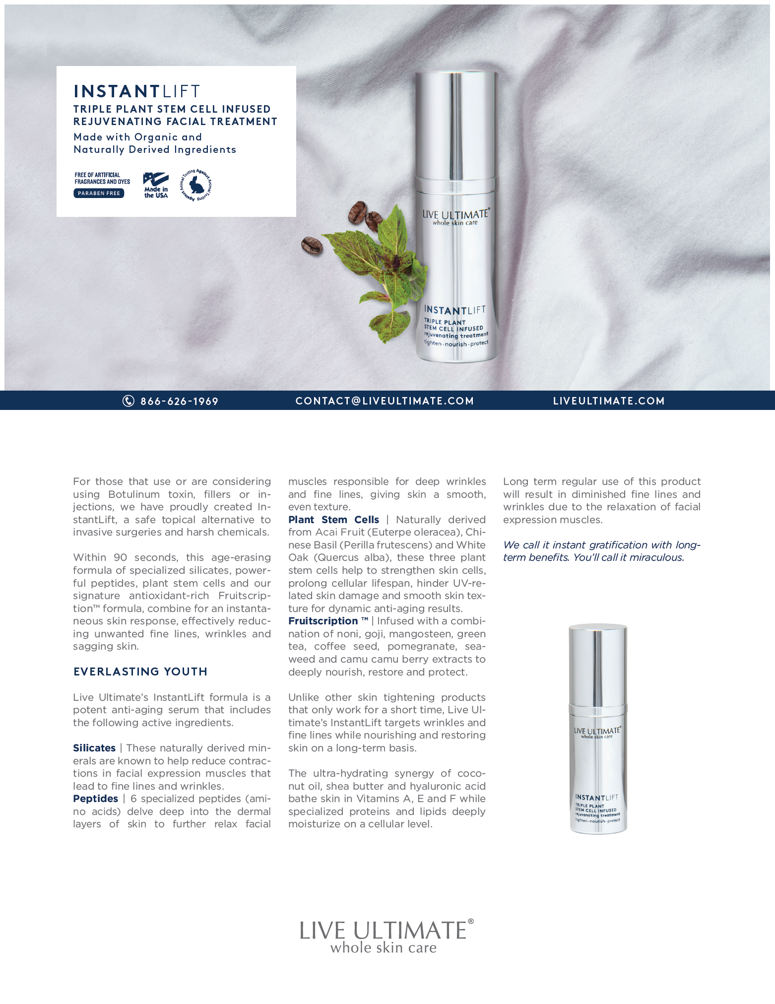 For those that use or are considering using Botulinum toxin, fillers or injections, we have proudly created InstantLift, a safe topical alternative to invasive surgeries and harsh chemicals.